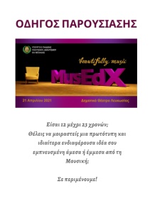 Είσαι 12 μέχρι 23 χρονών; Θέλεις να μοιραστείς μια πρωτότυπη και ιδιαίτερα ενδιαφέρουσα ιδέα σου εμπνευσμένη άμεσα ή έμμεσα aπό τη Μουσική; Σε περιμένουμε! ΟΔΗΓΟΣ ΠΑΡΟΥΣΙΑΣΗΣ