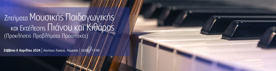 Το Γραφείο Επιθεώρησης Μουσικής Μέσης Γενικής Εκπαίδευσης του Υπουργείου Παιδείας, Αθλητισμού και Νεολαίας διοργανώνει υβριδική ημερίδα με θέμα Ζητήματα Μουσικής Παιδαγωγικής και Εκτέλεσης Πιάνου και Κιθάρας - Προκλήσεις, Προβλήματα, Προοπτικές, που θα πραγματοποιηθεί το Σάββατο 6 Απριλίου 2024 στο Λανίτειο Λύκειο στη Λεμεσό από τις 10:00 μέχρι τις 17:00.