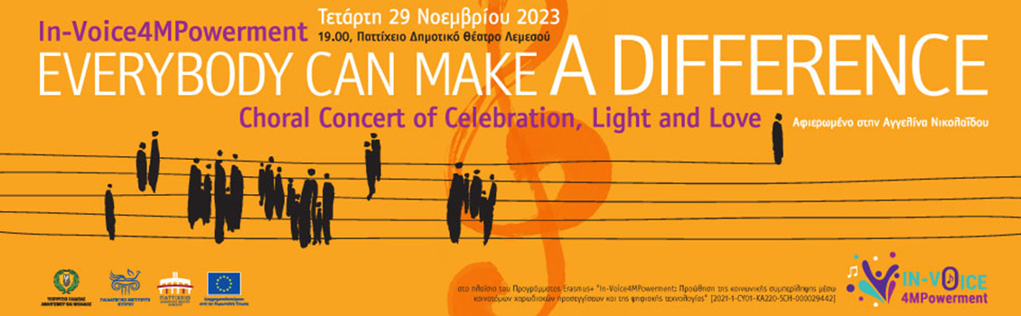 Το Πρόγραμμα Erasmus+ In-Voice4Empowerment [2021-1-CY01-KA220-SCH-000029442 ]στοχεύει στην προώθηση της κοινωνικής συμπερίληψης μέσω της ανάπτυξης ενός καινοτόμου διαθεματικού-διακαλλιτεχνικού προγράμματος με έμφαση στη χορωδιακή μουσική. Το Πρόγραμμα συνδυάζει στοιχεία από το χορωδιακό τραγούδι, τα φωνητικά ηχοτοπία, την εκφραστική κίνηση, το χορωδιακό θέατρο, μέσα από βιωματικές μουσικές εμπειρίες και αξιοποιώντας τον λόγο και την εικόνα στο πλαίσιο της μουσικής εκτέλεσης με αποτέλεσμα την ανάπτυξη επικοινωνίας που νοηματοδοτείται από τους/τις ίδιους/ες τους/τις συμμετέχοντες/ουσες. Παράλληλα, οι νέοι και οι νέες που συμμετέχουν σε χορωδιακά σύνολα έχουν την ευκαιρία να εκφραστούν δημιουργικά μέσω της ψηφιακής τεχνολογίας και σύνθεσης, να ενδυναμωθούν και να ανακαλύψουν και να εκφράσουν τη Φωνή τους κυριολεκτικά και μεταφορικά. Περισσότερες πληροφορόες μπορείτε να δείτε στην ιστοσελίδα του προγράμματος https://in-voice.schools.ac.cy/en/home/