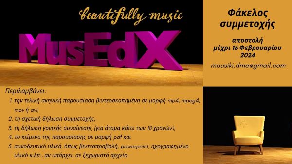Πρόσκληση συμμετοχής νέων για παρουσίαση αξιόλογων ιδεών με έμπνευση τη μουσική "MusEdX 2024" 11/12/2023
